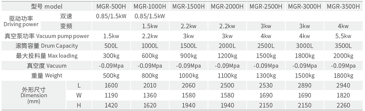 The MGR-H series rolling and kneading machine adopts a horizontal and fixed bracket, with a compact structure. Suitable for pickling and processing Western style sausages, ham, bacon, grilled meat, as well as traditional Chinese poultry, sauce braised, and snack foods.